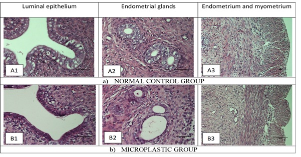 Gambarajah 1: Histopatologi analisis menunjukkan kesan pendedahan mikroplastik polistirena (PS-MPs) terhadap beberapa struktur histologi uterus model tikus