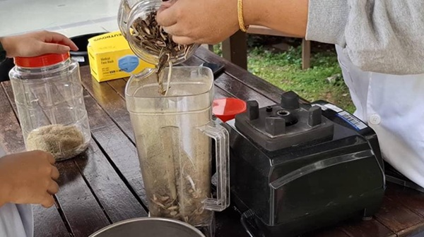 Para pelajar telah menuai keladi bunting daripada tasik berkenaan dan dibersihkan sebelum dibawa ke makmal di UPM kampus Serdang. Proses pengeringan keladi bunting ini mengambil masa selama sebulan untuk memastikan keladi bunting itu benar-benar kering dan mempunyai kandungan kelembapan yang rendah. Seterusnya, keladi bunting itu dikisar menggunakan sebuah mesin pengisar heavy-duty dan disaring dengan penyaring 1 mm untuk memisahkan partikel atau serat yang bersaiz lebih besar demi mendapatkan serbuk keladi bunting yang halus. Selesai proses penyaringan, pengikat (binder) gelatin dihasilkan daripada campuran tepung ubi kayu dan air panas yang dikacau sehinggan menjadi likat. Pengikat adalah bahan penting dalam penghasilan bahan api pepejal biojisim kerana fungsi utama pengikat adalah untuk memastikan bentuk bahan api tersebut itu dapat dikekalkan tanpa berderai dengan mudah.