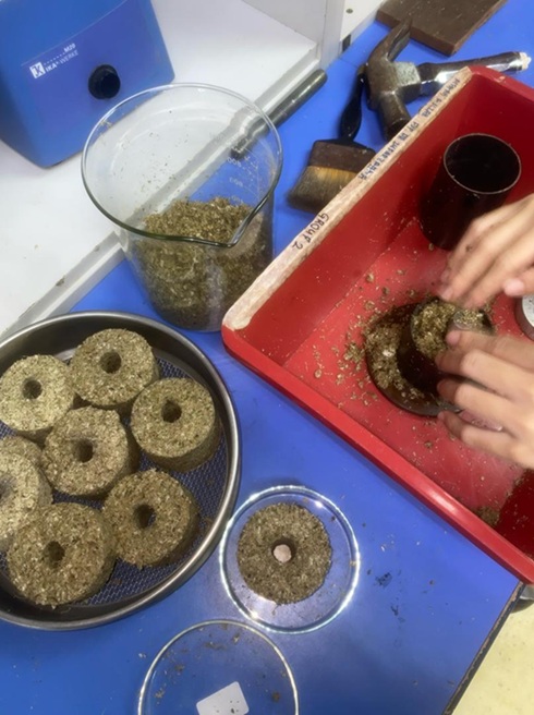 Proses pembentukan kek briket keladi bunting dengan menggunakan penekan hidraulik (tiada dalam gambar), acuan, dan kanji ubi kayu sebagai pengikat