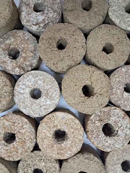 Produk briket keladi bunting yang telah dikeringkan dan sedia untuk dijadikan bahan api alternatif