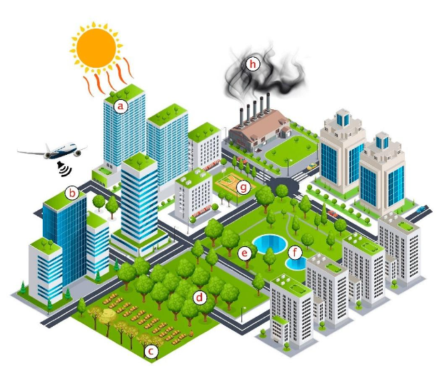 In our relentless push for urbanisation, we've seriously messed up the delicate balance between human habitation and the natural world. Urban landscapes, once lush and full of life, have completely transformed into concrete jungles where human infrastructure is the king. This transformation has caused many terrible consequences, including reversing ecosystem services. Ecosystem services - the incredible benefits nature gives us - are crucial for survival. But amid all this urban sprawl, these services are often compromised, putting our well-being at risk. That's why reversing this situation and focusing on sustainable urban development is essential. We need to recognise the many connections between urban ecosystems and public health, like how they help us deal with heat, improve our mental health and overall well-being by getting us in touch with nature, and effectively managing stormwater. And let's remember all the incredible benefits of green and blue infrastructures, like reducing pollution, storing carbon, producing food, reducing noise, and providing recreational and cultural spaces. Figure 1 explains (a) regulation of microclimate, (b) noise reduction, (c) food production, (d) carbon storage and sequestration, (e) habitat provision, (f) run-off retention and water filtration, (g) recreational and cultural values, and (h) air purification