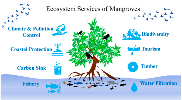 Mangroves are incredibly productive and diverse ecosystems that can be found all over the world in coastal wetlands. These plants have amazing adaptations that help them survive in challenging environments, and they provide a wide range of benefits to local communities. Ecosystem services are like the perks we get from nature, showing just how valuable natural resources are for our well-being and sustainability. According to the Millennium Ecosystem Assessment (MEA), these services can be divided into four categories: things like food resources, climate regulation, cultural activities such as tourism and recreation, and the support they provide to various habitats. The MEA aimed to provide decision-makers and the general public with scientific data on how global change impacts ecosystems and, in turn, how that affects us. Mangrove forests offer numerous ecosystem services that benefit both local communities and the global environment (Figure 1). So, here are some really cool examples of what mangrove ecosystems can do:
